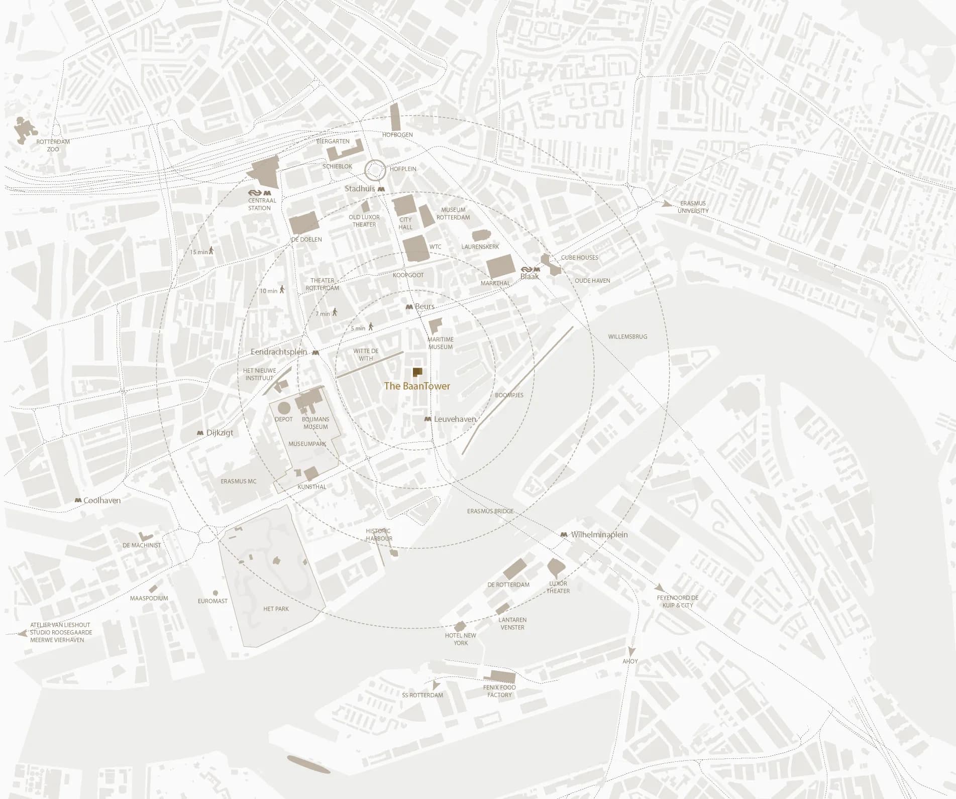 The BaanTower is gelegen in het Baankwartier. De populaire Witte de Withstraat, met een groot aanbod van restaurants, bars, winkels en galeries, ligt om de hoek. Ook het Museumpark, de Leuvenhaven en de iconische Erasmusbrug liggen op loopafstand. Met metrostations Leuvehaven en Beurs en goede tramverbindingen in de buurt, is de hele stad binnen handbereik.